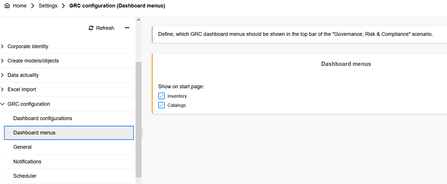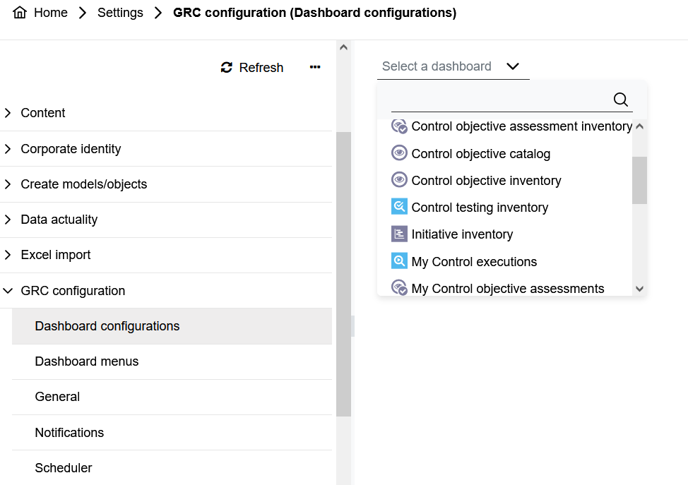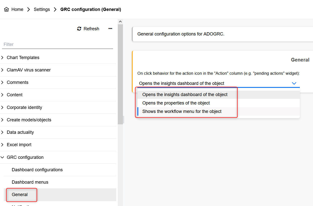 Certain ADOGRC features, such as dashboards, can be configured to meet the requirements of the users and adapt to their preferences. These options are available in the Settings section of the ADOGRC + ADONIS Administration.
