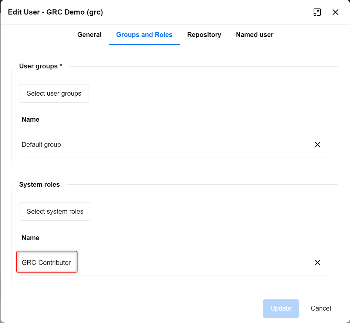 A user needs always at least the GRC Contributor system role to be able to view objects in the ADOGRC Scenario and participate in the ADOGRC workflows.