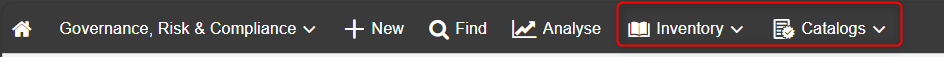 ADOGRC displays two drop-down menus in the main toolbar: Inventories and Catalogs of ADOGRC object types.