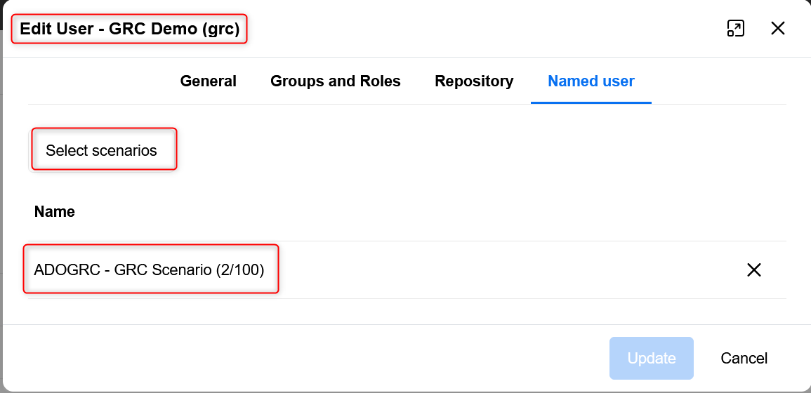 To assign a user to the ADOGRC Scenario, open them in the User Management in the ADONIS + ADOGRC Administration, switch to the Named User tab and click the Select scenarios button. Once a user is assigned the ADOGRC Scenario, the number of used and maximum licenses are shown next to the scenario.