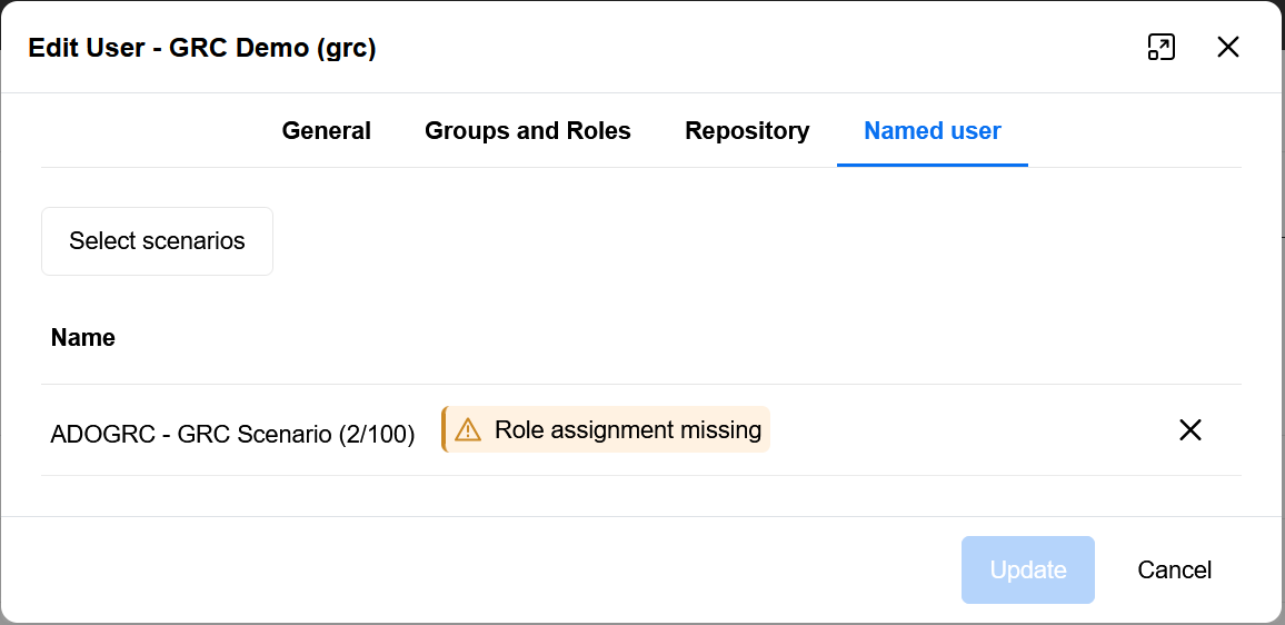 If the user's roles are not sufficient for the ADOGRC Scenario to work properly, there is a notification when assigning the ADOGRC Scenario to a user.