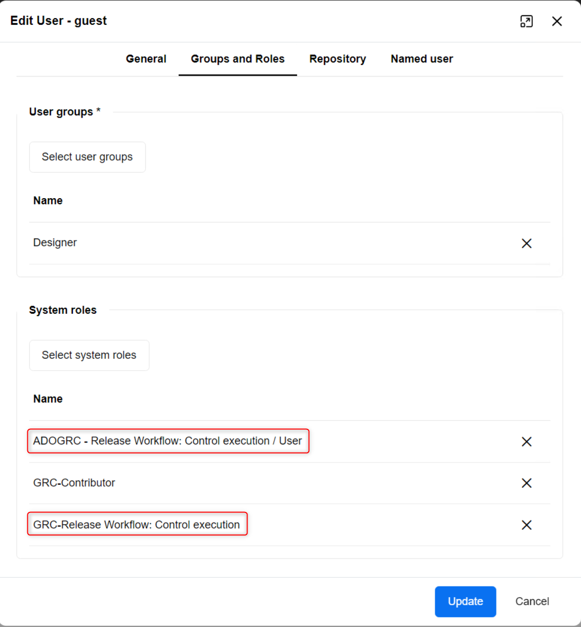 When a user is assigned to a workflow role, they always have to be assigned to the corresponding additional workflow role of the same class. There is one MFB role for each ADOGRC object class, e.g. if you assign a user to the system role ADOGRC - Release Workflow: Control Execution / User, then this user also has to be assigned to the additional workflow role GRC-Release Workflow: Control Execution*.