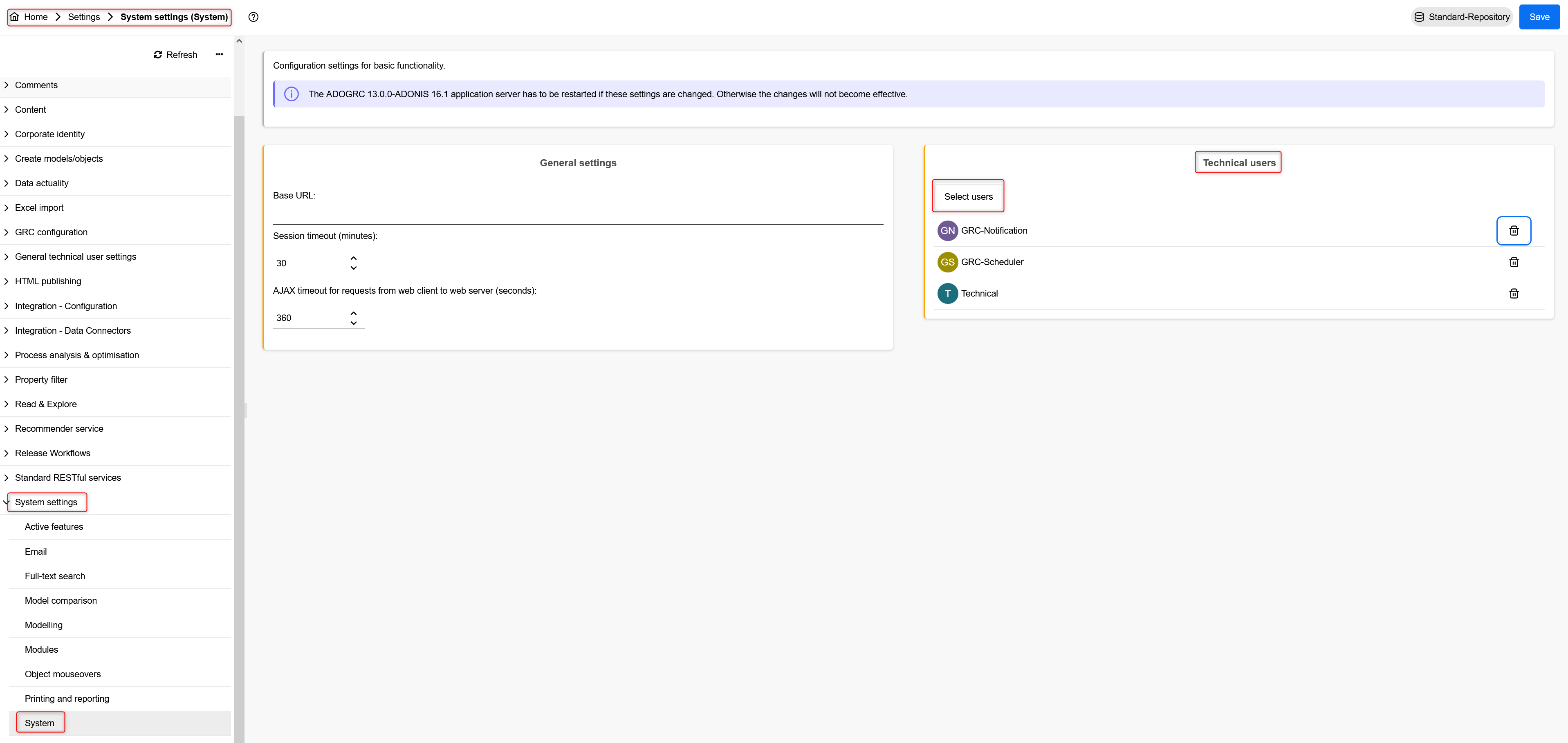 Open Settings in the ADONIS + ADOGRC Administration and then open the System Settings branch. Select System and verify on the right side of the page that the ADOGRC Technical Users are listed. In case they are not listed here, add them by clicking the Select users button and selecting them from the dialog which opens.Verify that the Technical Users have been configured correctly in the ADOGRC Settings
