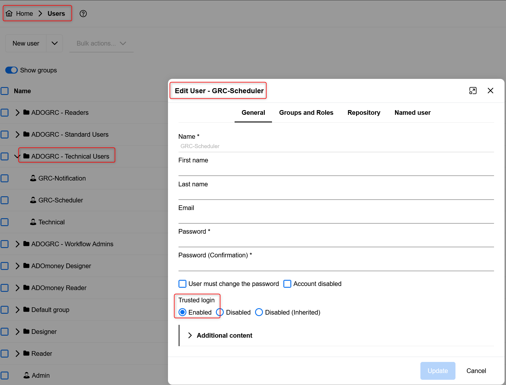 Open the Users Scenario in the ADONIS + ADOGRC Administration und open the users in the ADOGRC - Technical Users user group. Verify that Trusted Login is set to Enabled.