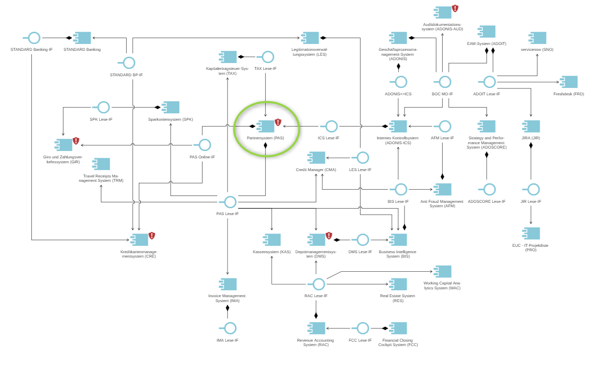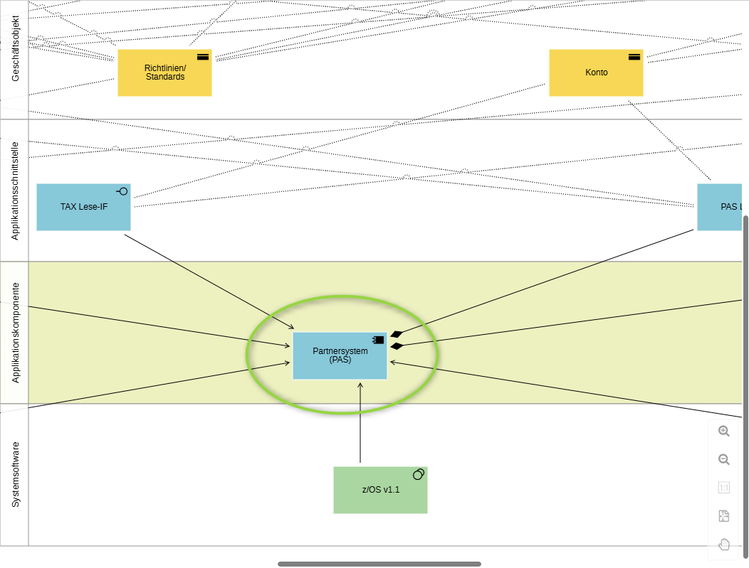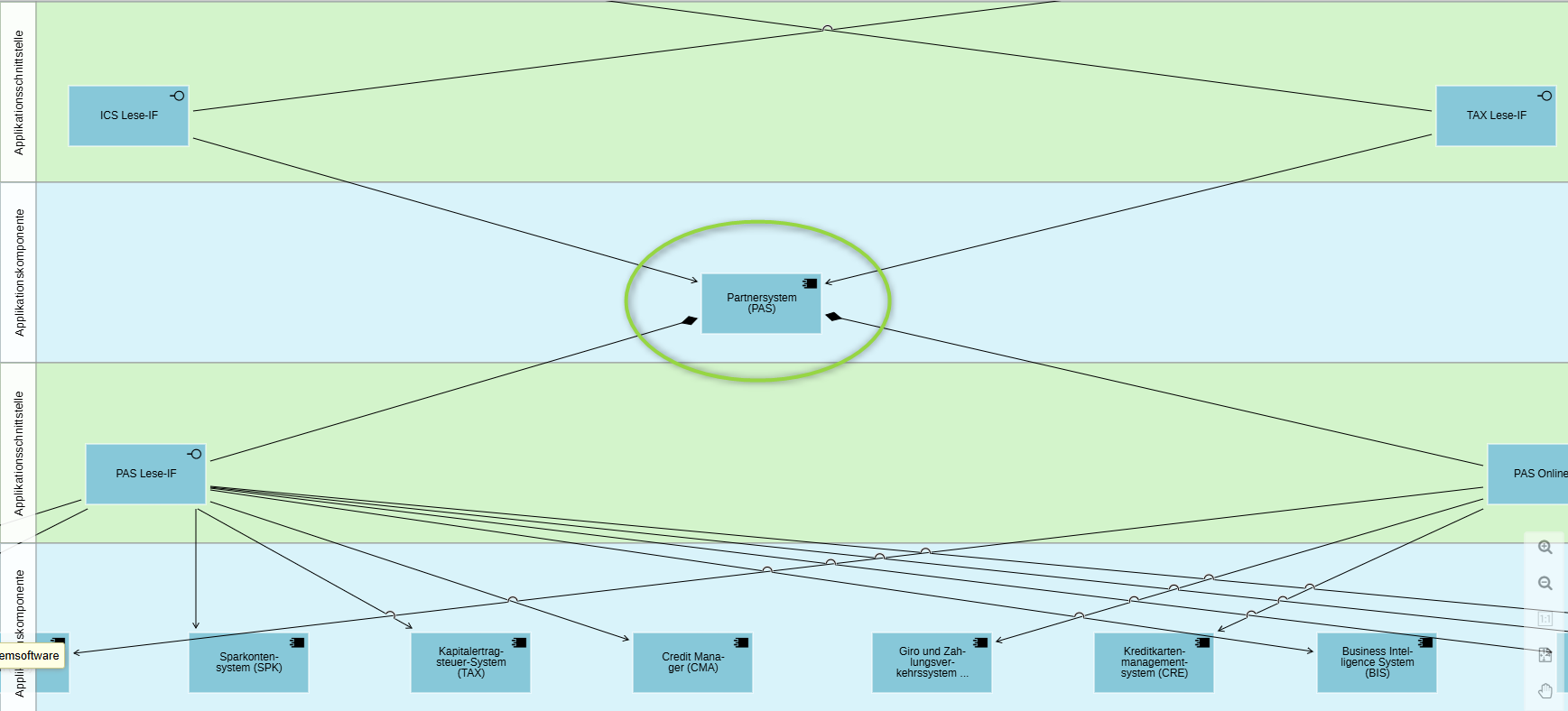 Eine Abhängigkeitsanalyse (BIA = Business Impact Analysis) zeigt den Einfluss eines Objekts auf die verschiedenen Architekturschichten. Mit dieser Sichtweise kann analysiert werden, welche Auswirkungen die Ablösung der Applikations-Komponente "Partnersystem (PAS)" mit sich bringt.