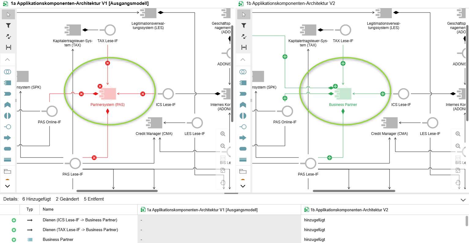 Entwerfen Sie Ihre zukünftige Architektur und visualisieren Sie die Unterschiede zwischen Ihren SOLL- und IST-Zuständen durch einen grafischen und tabellarischen Modellvergleich. In diesem Beispiel sehen wir einen Vergleich zwischen der aktuellen und der zukünftigen Architekturlandschaft.