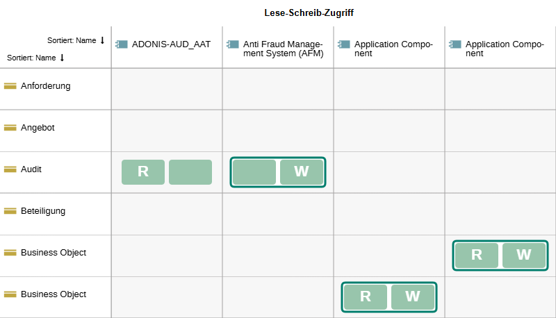 Wir beginnen mit einem Matrix-Chart, der Ihre Applikationskomponenten, die Informationen, auf die sie in Form von Geschäftsobjekten zugreifen, sowie den Grad der Manipulation dieser Daten mit der Methode "Read/Write" zeigt. An diesem Beispiel sehen wir, dass es innerhalb des Unternehmens eine Datenredundanz gibt. Das bedeutet, dass die vorhandenen Applikationskomponenten die Daten in einer Form manipulieren, die nicht erlaubt ist.
