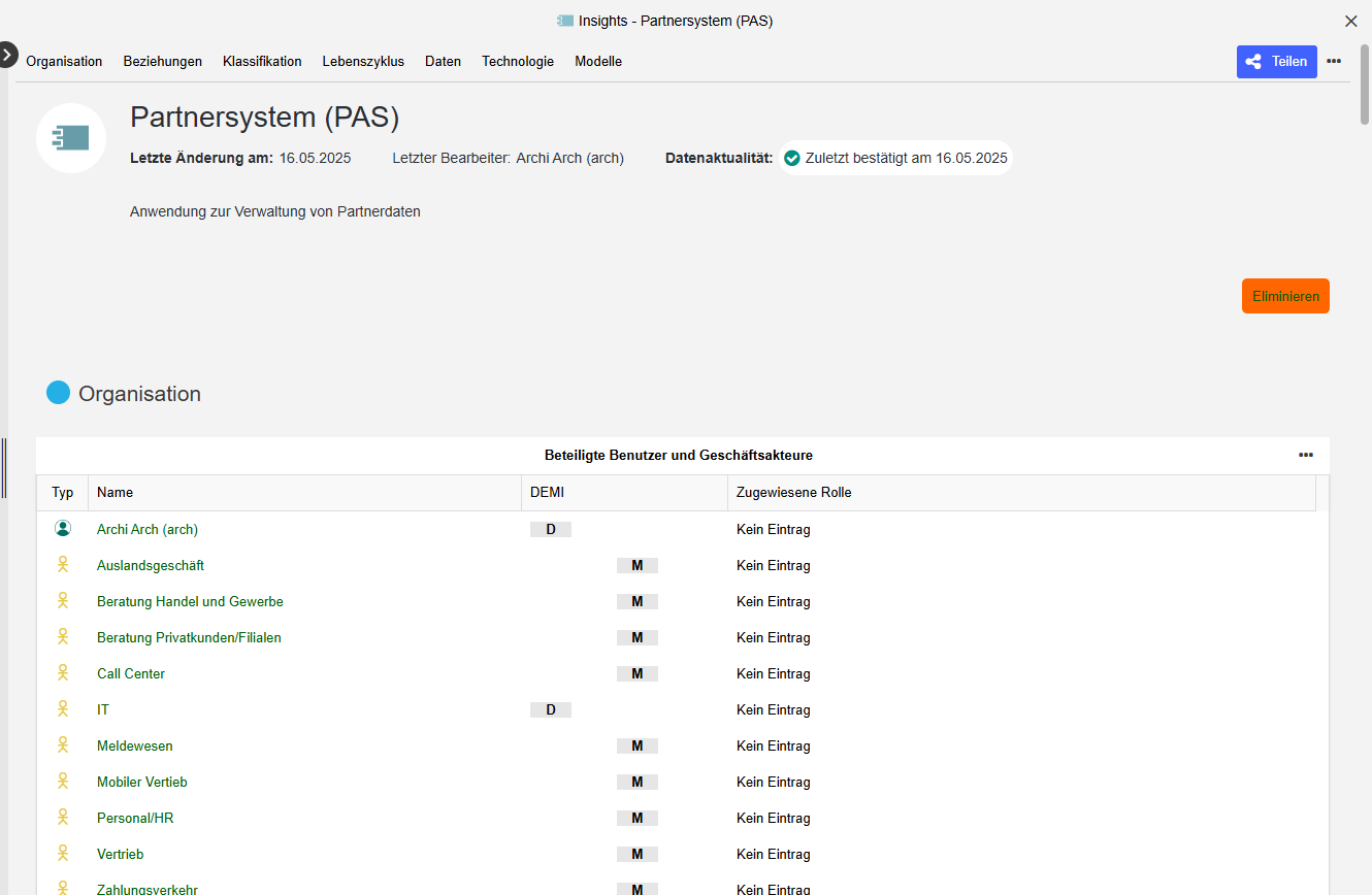 Das Insights-Dashboard visualisiert alle wichtigen Informationen zu Ihren Objekten. In diesem Beispiel zeigt das Dashboard erweiterte Informationen über die Applikationskomponente "Partnersystem (PAS)" an– genauer gesagt deren Applikationsbewertung, benachbarte Applikationskomponenten sowie die verwendete Systemsoftware.