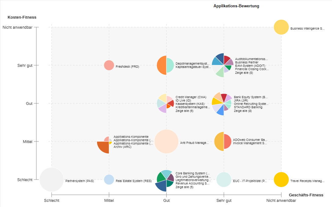 In einem Bubble-Chart werden alle Ihre Applikationskomponenten nach bestimmten Kriterien verglichen. In diesem Beispiel wird das Anwendungsportfolio anhand seiner IT-Fitness, Geschäfts-Fitness und strategischer Bedeutung bewertet. Daraus lässt sich ableiten, dass die Applikationskomponente "Partnersystem (PAS)" in Bezug auf die IT- und Geschäfts-Fitness unzureichend bewertet ist.