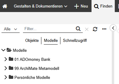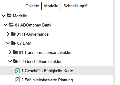 | Klicken Sie in der oberen Menü-Leiste auf "Finden", und dann im linken Seitenbereich auf "Modelle", um auf den Modellkatalog zuzugreifen. | Erweitern Sie den Ordner "01 ADOmoney Bank", dessen Unterordner "02 EAM", und darin den Ordner "02 Geschäftsarchitektur". | Öffnen Sie das Modell "1 Geschäfts-Fähigkeits-Karte" im Verzeichnis. |
