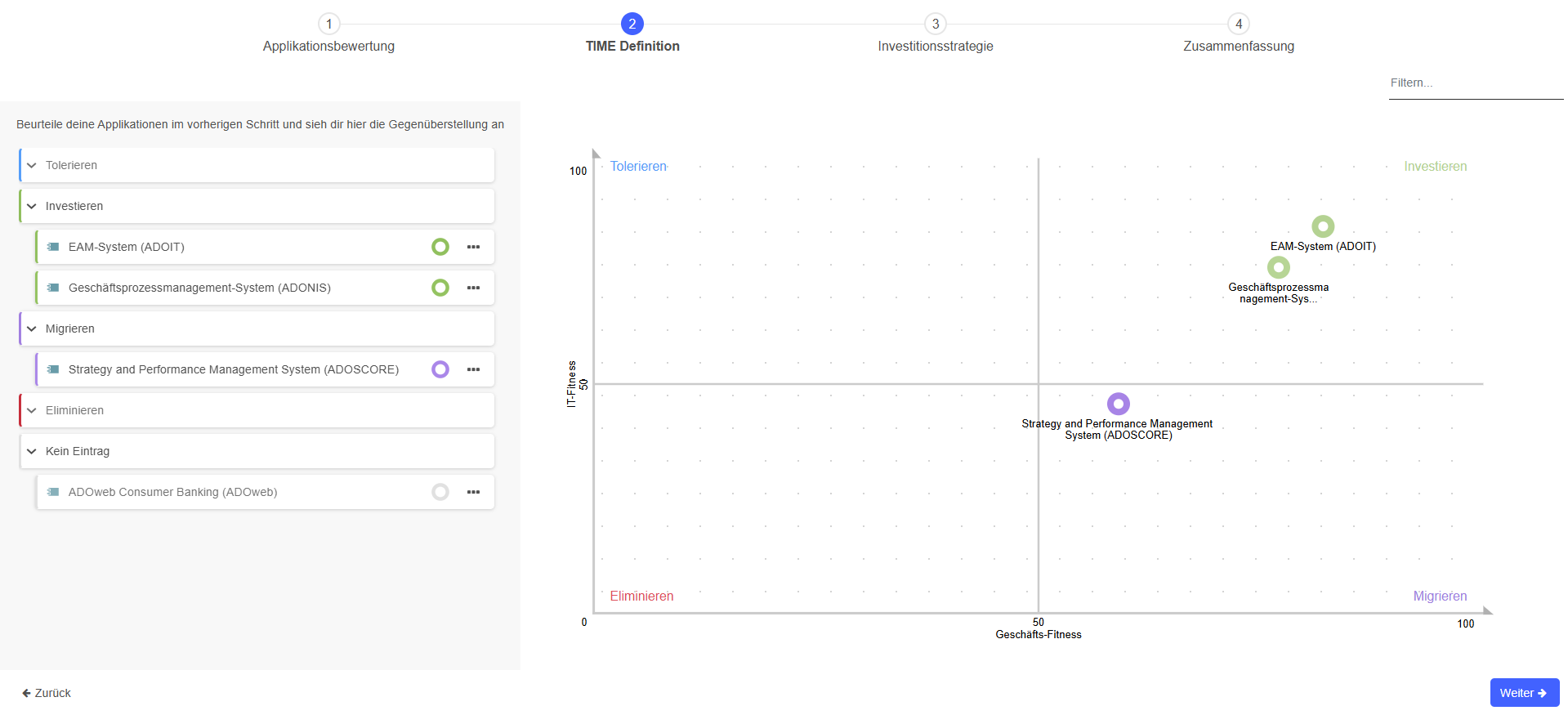 Für jede Anwendung muss sowohl die Geschäfts-Fitness als auch die IT-Fitness bewertet werden. Dazu gibt es zwei Möglichkeiten: