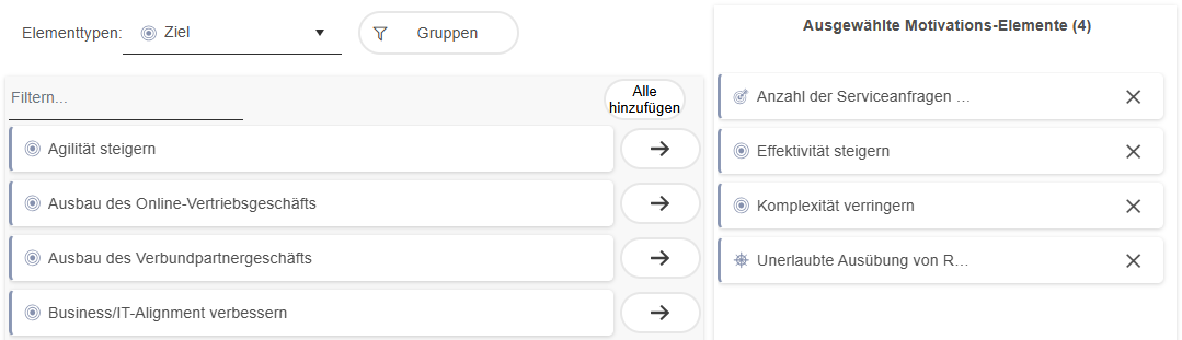 - Gruppen: Verwenden Sie diesen Filter, um Motivations-Elemente aus bestimmten Objektgruppen auszuwählen.