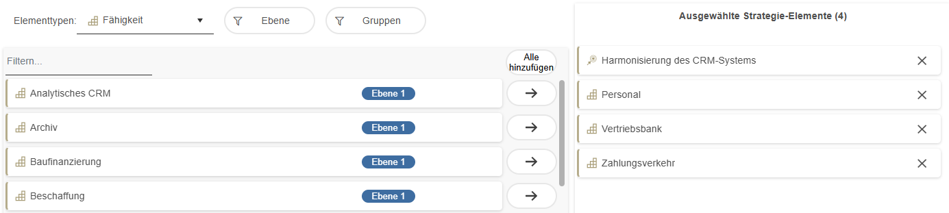 - Gruppen: Verwenden Sie diesen Filter, um Strategie-Elemente aus bestimmten Objektgruppen auszuwählen.