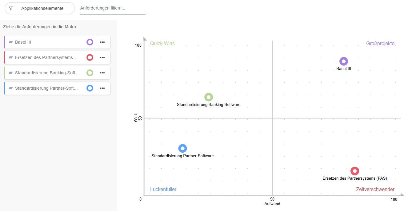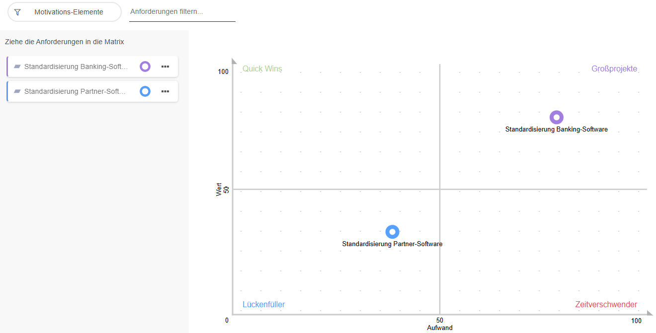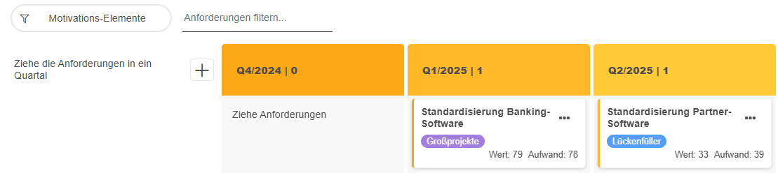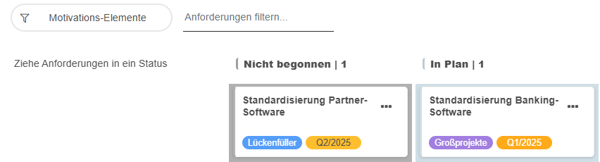 Tabelle/Kanban-Zusammenfassung: Bietet eine detaillierte Übersicht über alle Motivations-Elemente und ihre zugewiesenen Anforderungen, einschließlich Priorisierungskategorie, geplantem Quartal und aktuellem Status. Mit den Symbolen