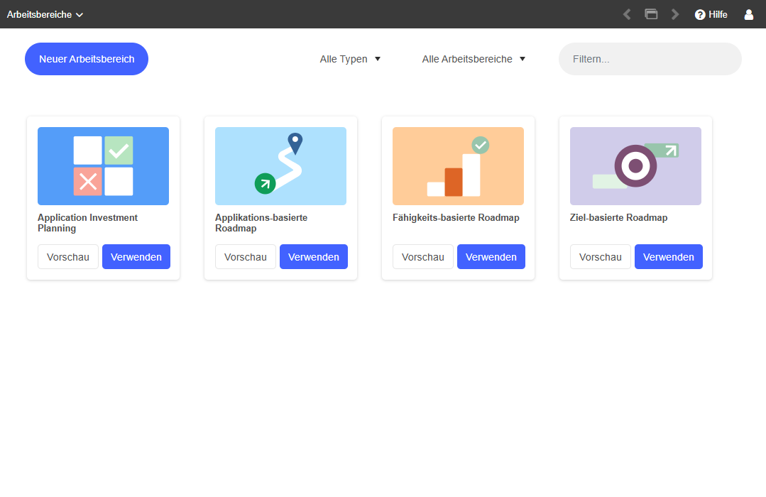 Auf der Seite Arbeitsbereiche werden alle erstellten Arbeitsbereiche angezeigt. Wenn noch keine Arbeitsbereiche vorhanden sind, werden stattdessen die Vorlagen für die Erstellung neuer Arbeitsbereiche angezeigt.