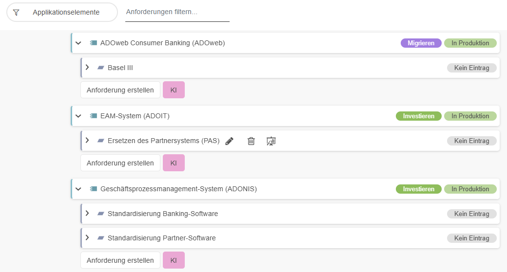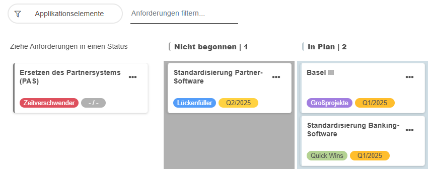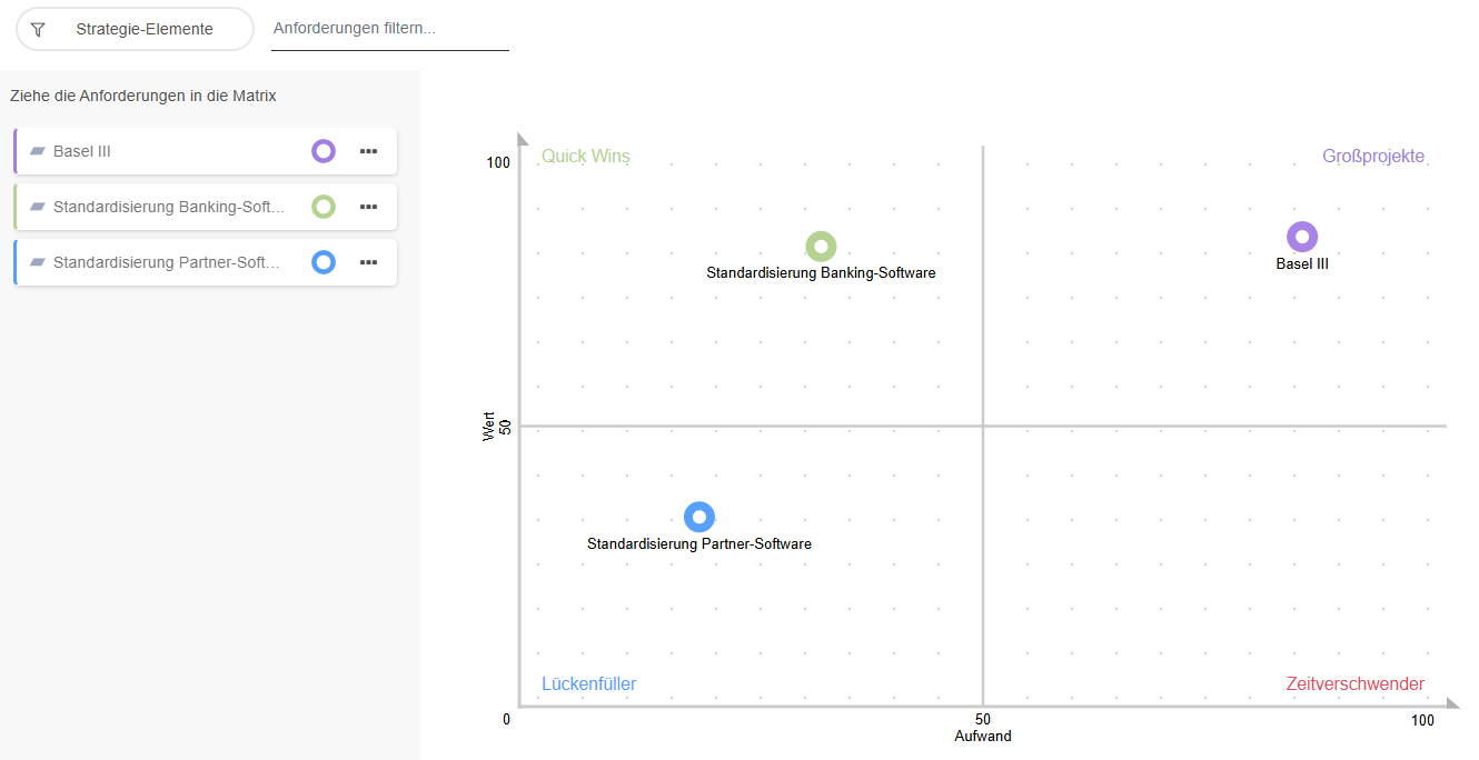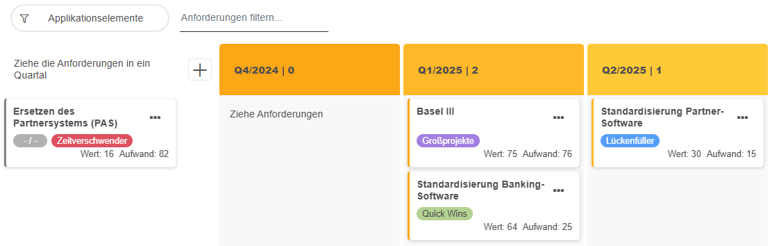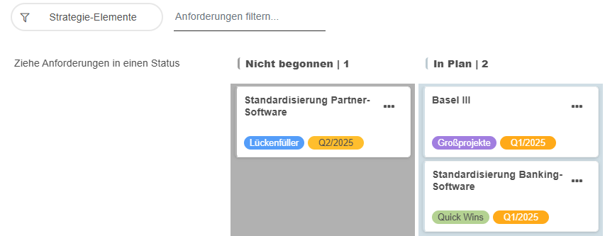Tabelle/Kanban-Zusammenfassung: Bietet eine detaillierte Übersicht über alle Strategie-Elemente und ihre zugewiesenen Anforderungen, einschließlich Priorisierungskategorie, geplantem Quartal und aktuellem Status. Mit den Symbolen