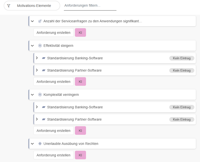Die Motivations-Elemente werden zusammen mit den zugeordneten Anforderungen aufgelistet..