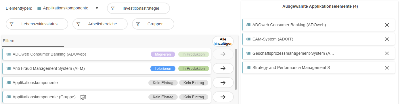 Wählen Sie die Elementtypen aus, die Sie in Ihrem Arbeitsbereich berücksichtigen wollen. Die verfügbaren Optionen hängen von der gewählten Vorlage ab. Für Applikations-basierte Roadmaps können Sie zum Beispiel Applikationselemente wie