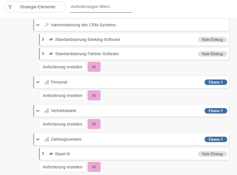 Die Strategie-Elemente werden zusammen mit den zugeordneten Anforderungen aufgelistet.. Darüber