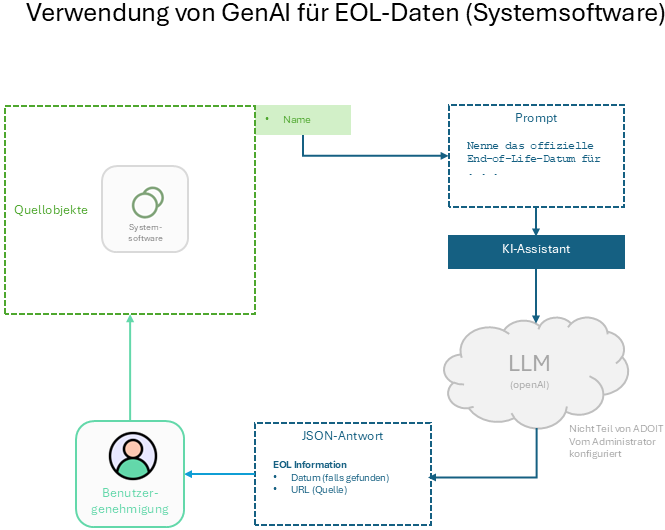 Nach der Aktivierung sendet ADOIT einen Prompt an das konfigurierte LLM, basierend auf dem Namen der Systemsoftware. Die Antwort des LLM enthält potenzielle End-of-Life-Informationen, die den Benutzer angezeigt werden. Sofern ein konkretes Datum enthalten ist, kann dieses optional in das Attribut Datum Wartungsende übernommen werden.