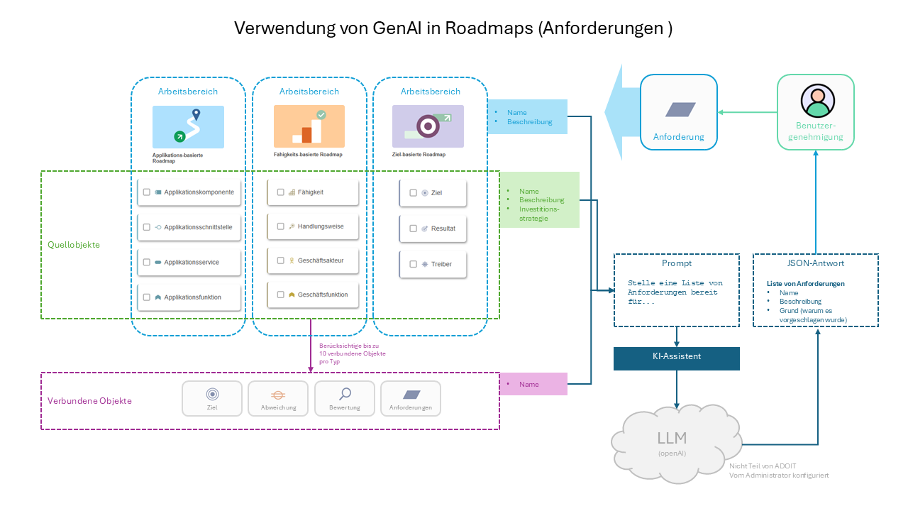 Dieser Abschnitt erläutert detaillierter, wie ADOIT mit Hilfe von Prompts und Repository-Daten mit einem konfigurierten Large Language Model (LLM) interagiert. Zudem wird dargestellt, welche Daten übermittelt werden, welche Art von Antworten erwartet wird und welche assistenzähnliche Rolle die Funktionalität einnimmt.