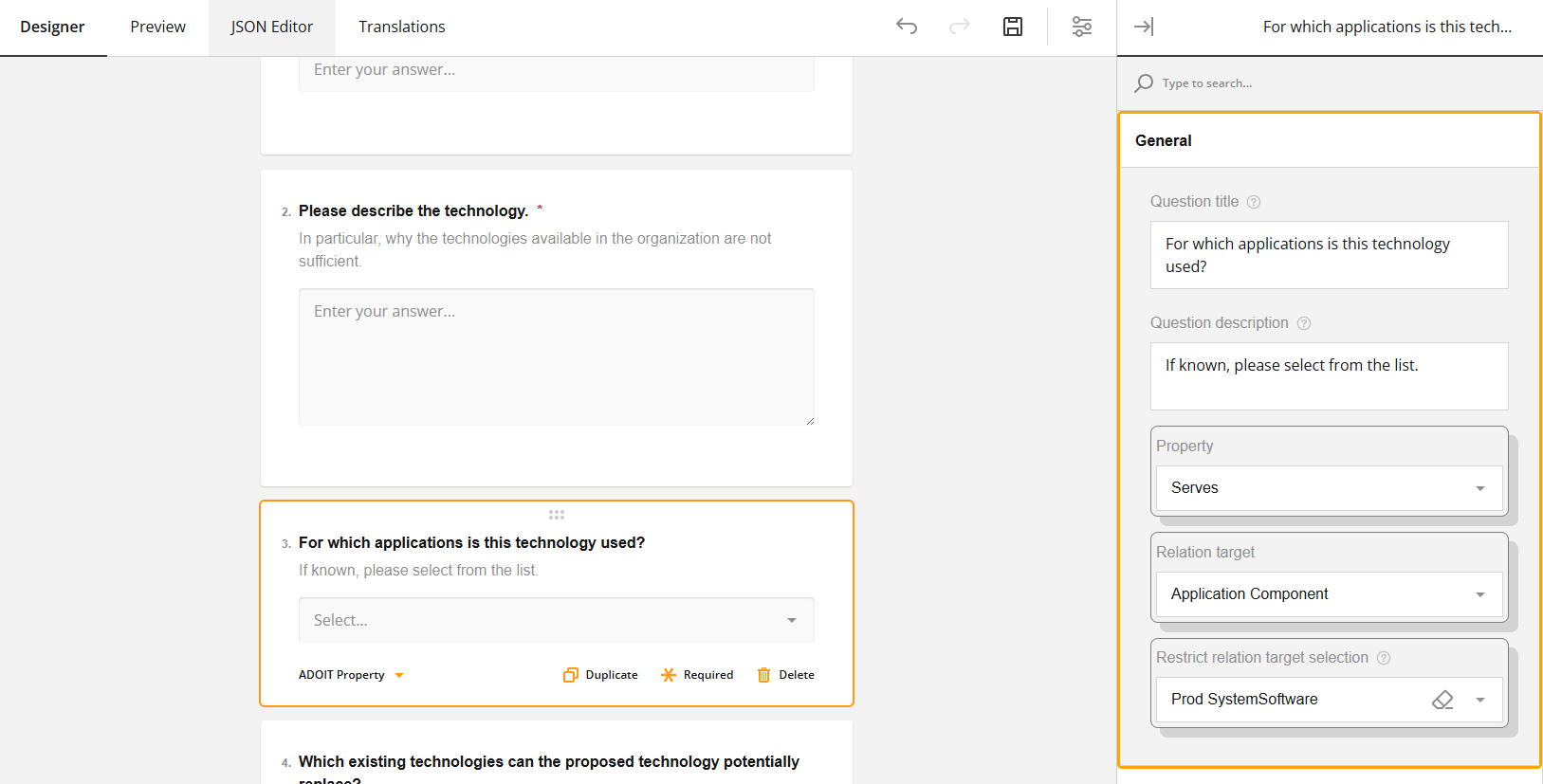 5. Restrict relation target selection: For property values of type relation, it is possible to select a saved ADOIT search query to limit the selectable target objects for this question.