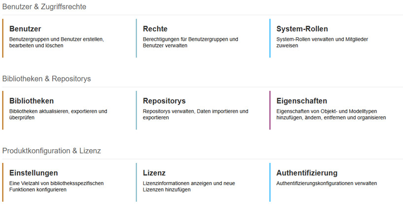 - Repositorys: Verwaltung von Repositorys, Import/Export von Migrationspaketen und Modellen