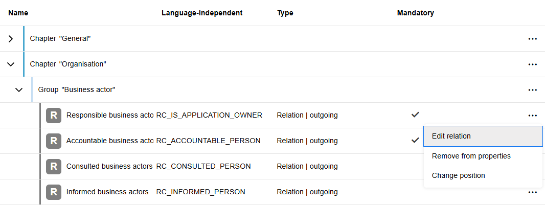 The Properties component in ADOIT Administration now allows editing relations. Administrators can rename relations and mark them as mandatory, ensuring that certain relations must be filled out in ADOIT.
