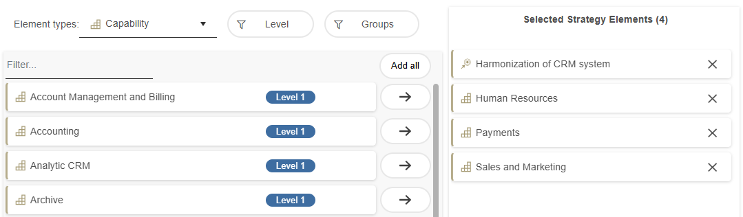 - Groups: Use this filter to select strategy elements from specific object groups.