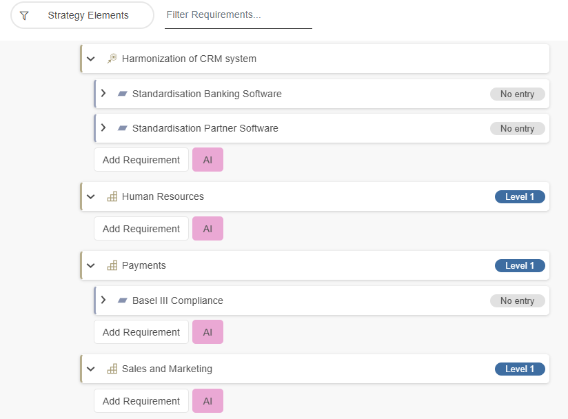 There are two ways to add requirements to a strategy element. Choose one of the following options: