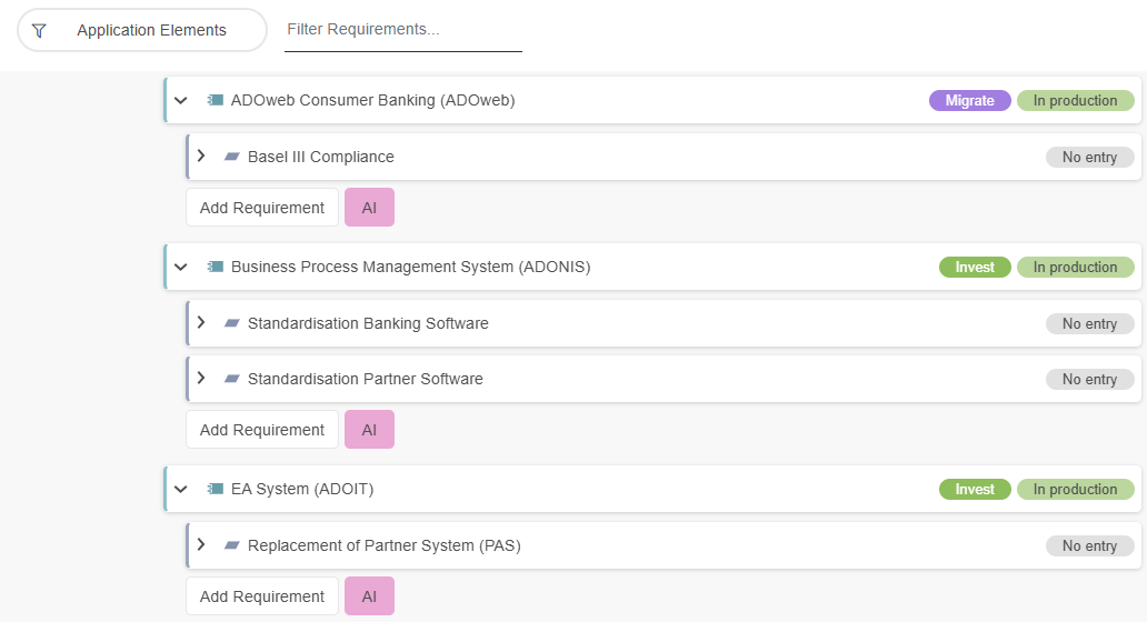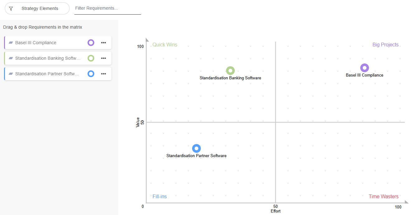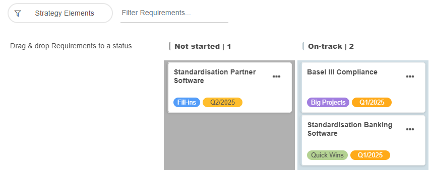 Table/Kanban Summary: Provides a detailed overview of all strategy elements and their assigned requirements, including prioritisation category, planned quarter, and current status. You can switch between a table view and a Kanban board using the