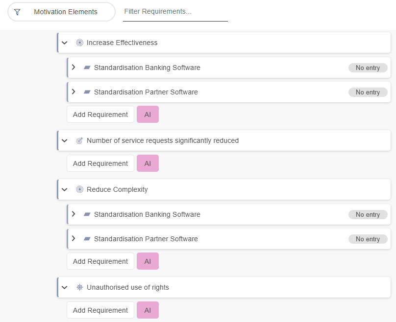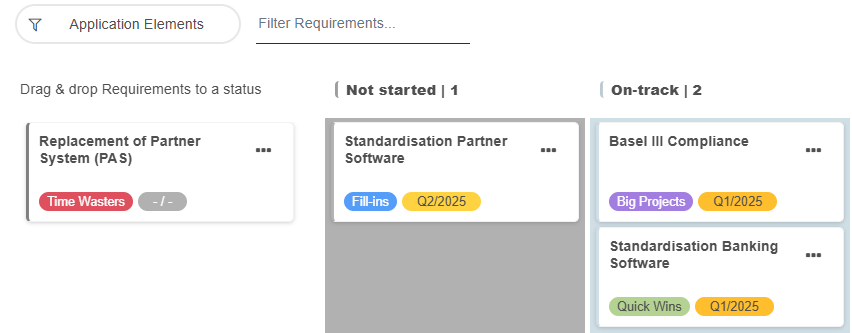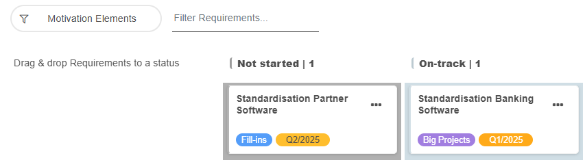 Table/Kanban Summary: Provides a detailed overview of all motivation elements and their assigned requirements, including prioritisation category, planned quarter, and current status. You can switch between a table view and a Kanban board using the