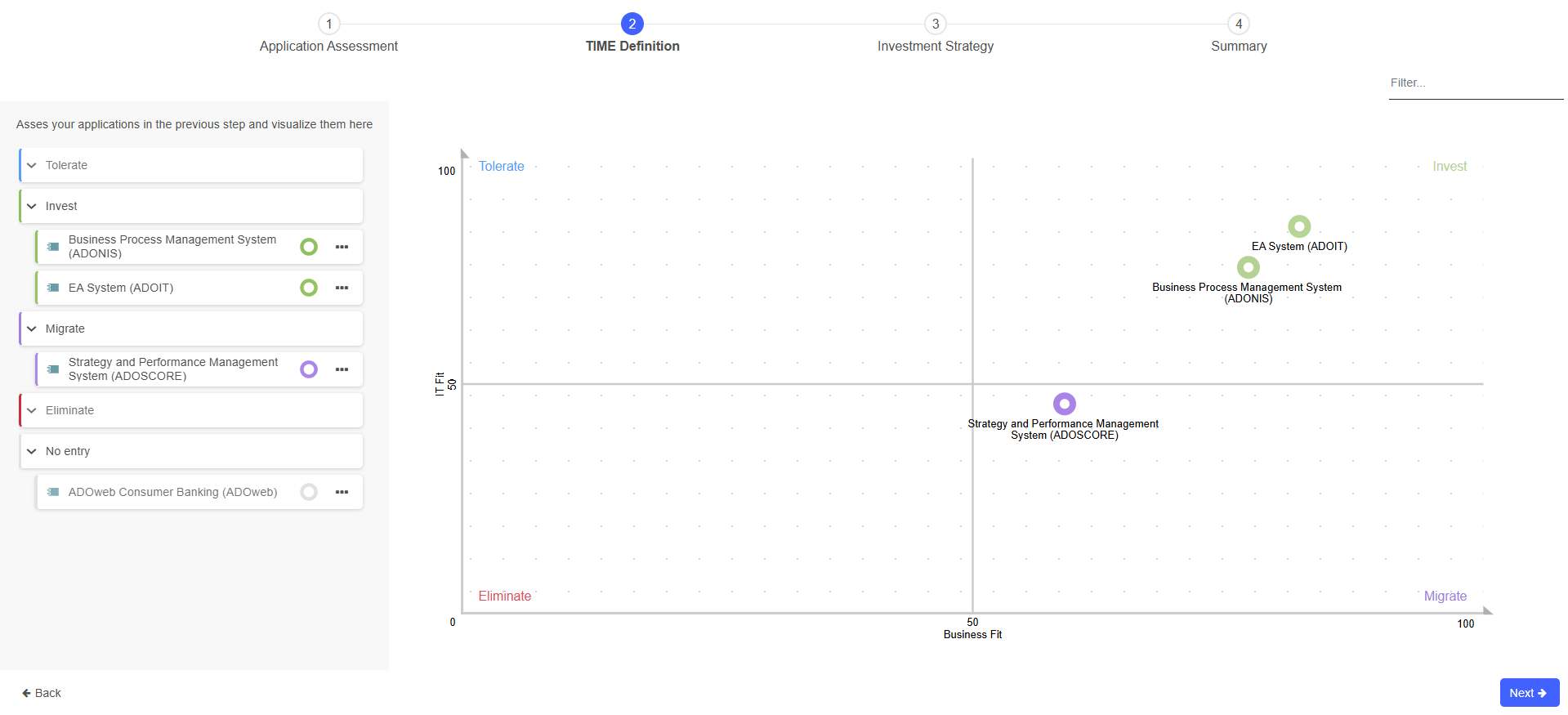 Once the applications have been defined, they must be assessed by answering a set of questions about their business and IT fitness.