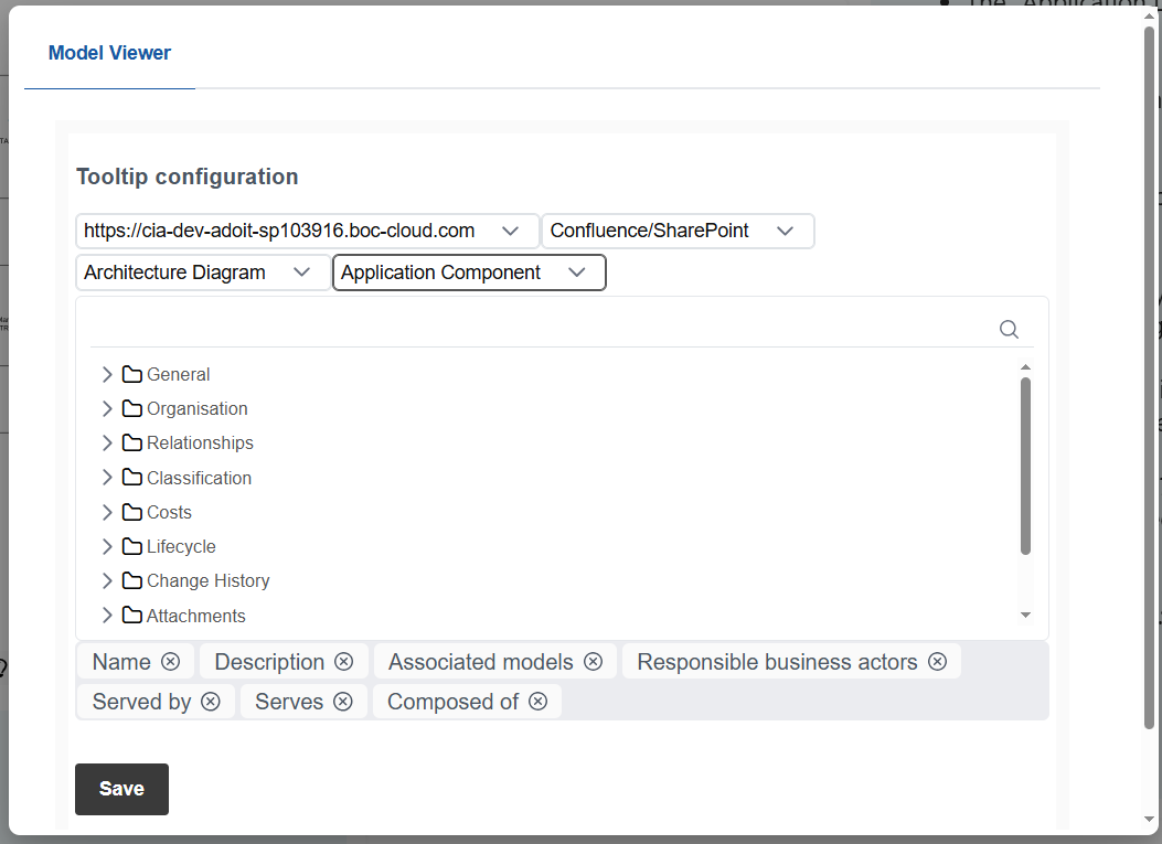 A configuration panel opens. Here you can add an ADOIT model URL, search for a specific model name, or select a model in the explorer view.
