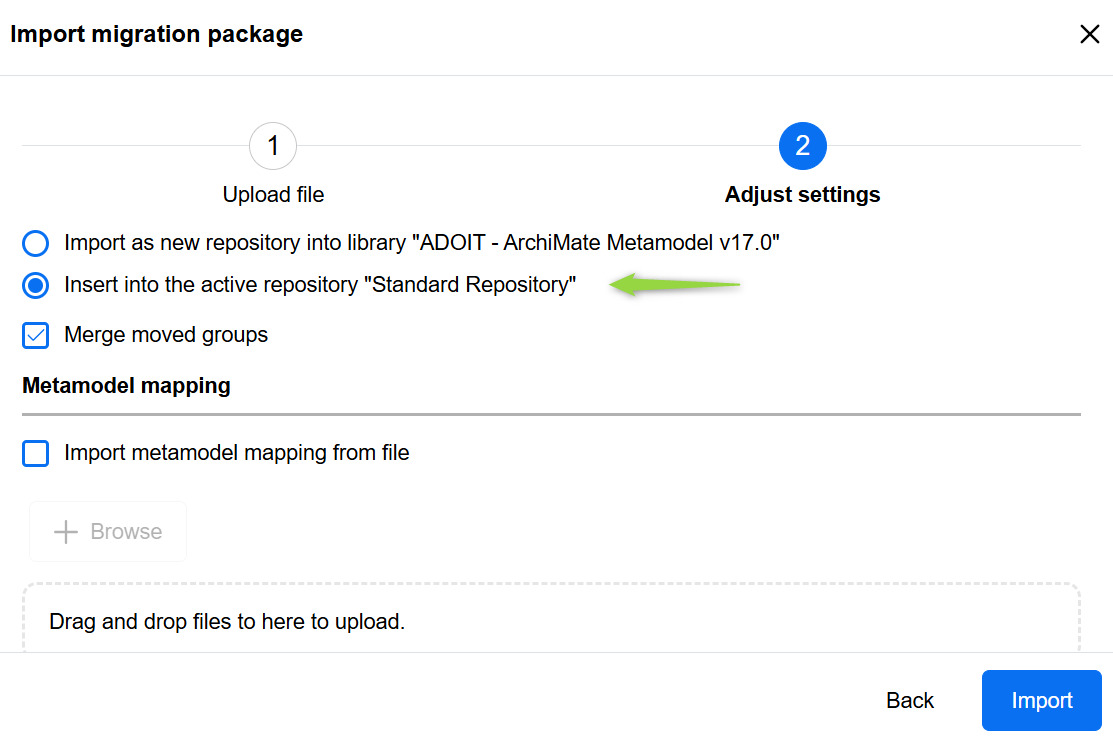 - Import the migration package directly into the active standard repository.