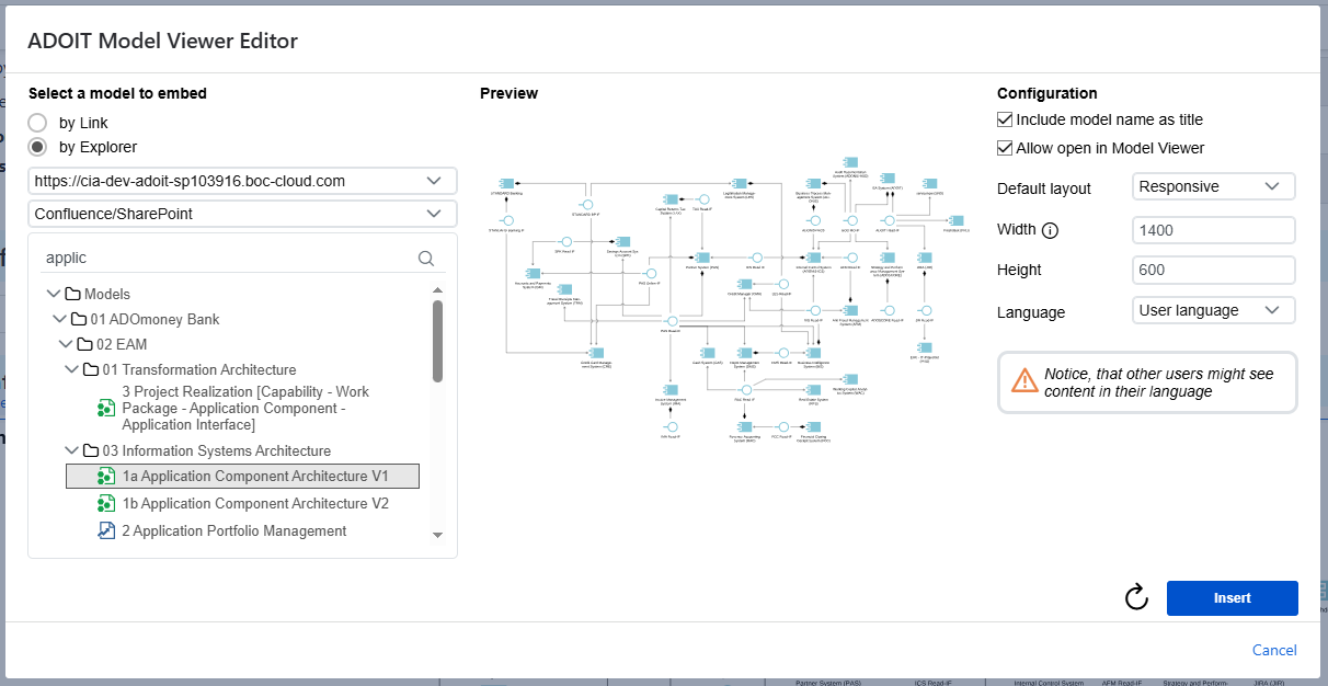 When you are done configuring your model viewer, click "Insert". In case you want to change the visualization later, the model viewer configuration can be adjusted at any time while editing your Confluence page.