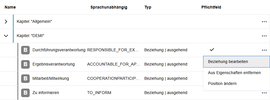Die Komponente Eigenschaften in der ADONIS Administration erlaubt nun die Bearbeitung von Beziehungen. Administratoren können Beziehungen umbenennen und als Pflichtfelder kennzeichnen, um klarzustellen, dass sie in ADONIS befüllt werden müssen.