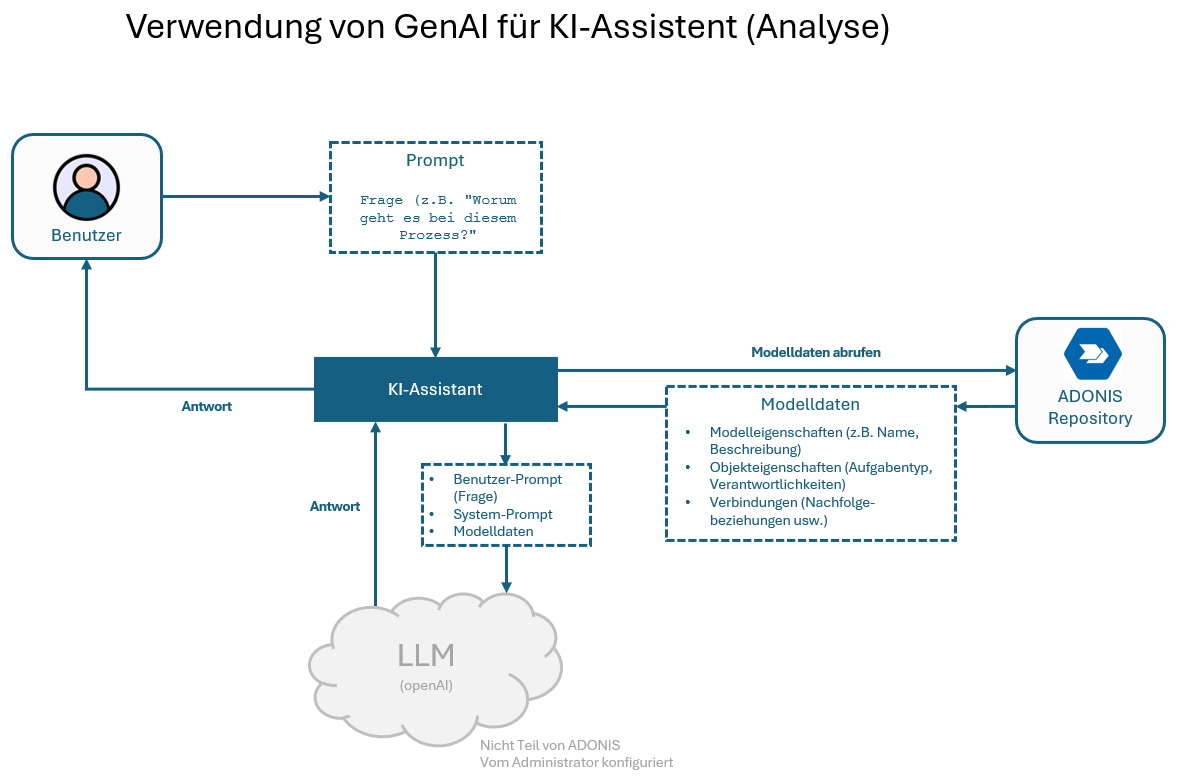Dieser Abschnitt erläutert detaillierter, wie ADONIS mit Hilfe von Prompts und Repository-Daten mit einem konfigurierten Large Language Model (LLM) interagiert. Zudem wird dargestellt, welche Daten übermittelt werden, welche Art von Antworten erwartet wird und welche assistenzähnliche Rolle die Funktionalität einnimmt.