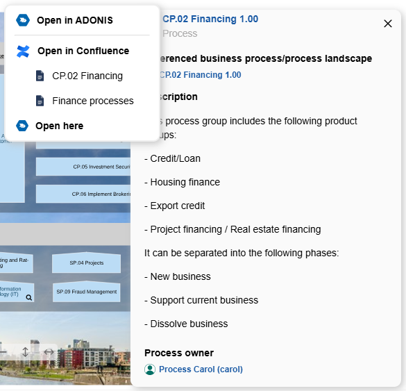 The Model Viewer macro of the ADONIS Process Manager for Confluence enables you to display an ADONIS model as an interactive image in Confluence.