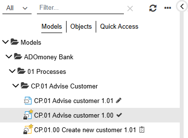 • Search for a Model or Object: In the Filter... box, type the text you want to search for. All models and/or objects that contain the search string in their name are shown.