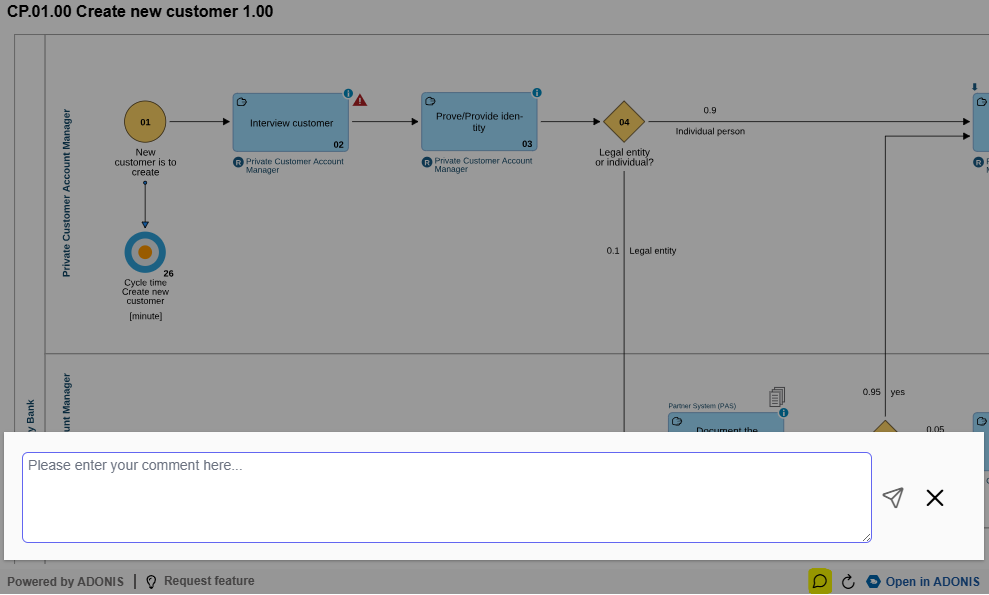 To create a new comment for the displayed model or object, just click on the comment icon in the Model Viewer footer or in the object tooltip, add your comment to the input field and click on the send icon.
