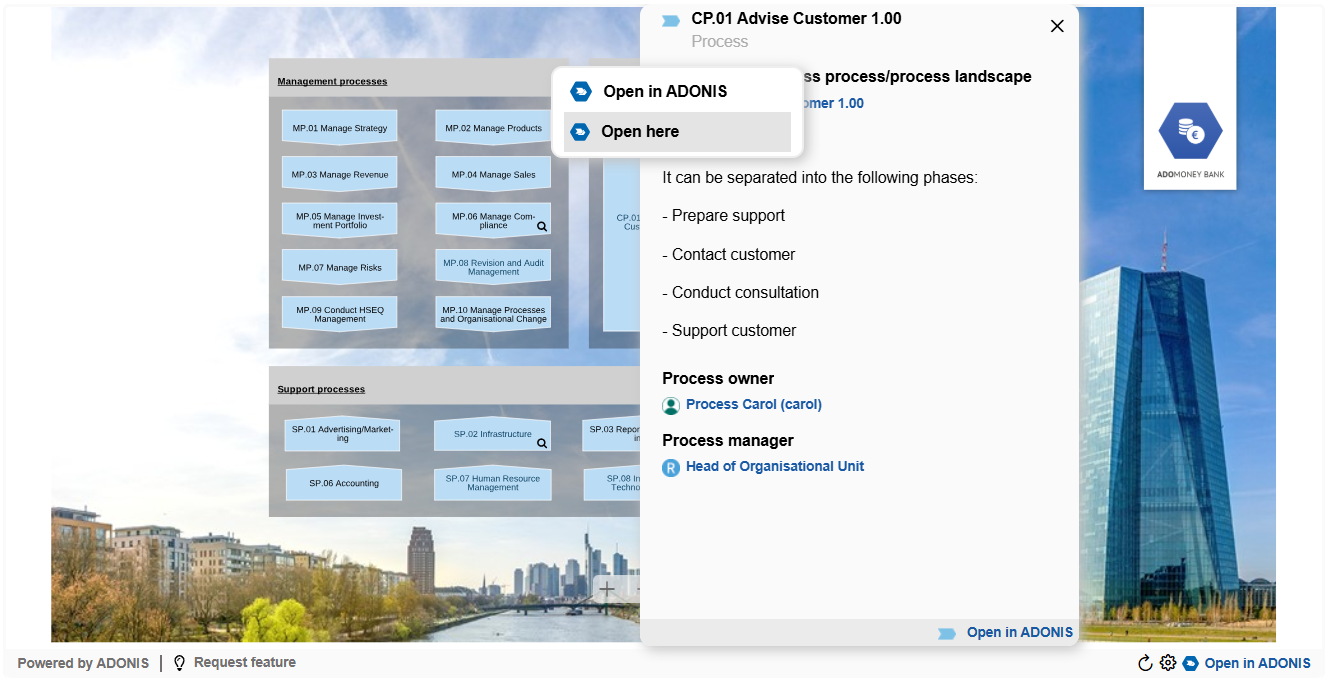 To open the corresponding model in ADONIS, click the "Open in ADONIS" button on the right below the model viewer.